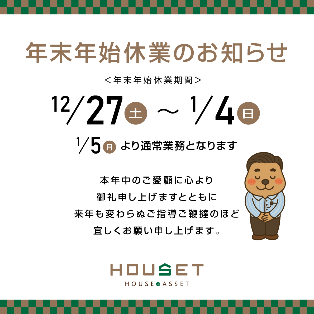 休業期間中にご連絡いただきました件については、1月5日(月)以降にご返答させていただきます。