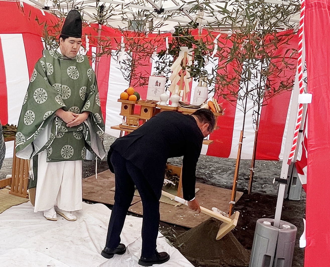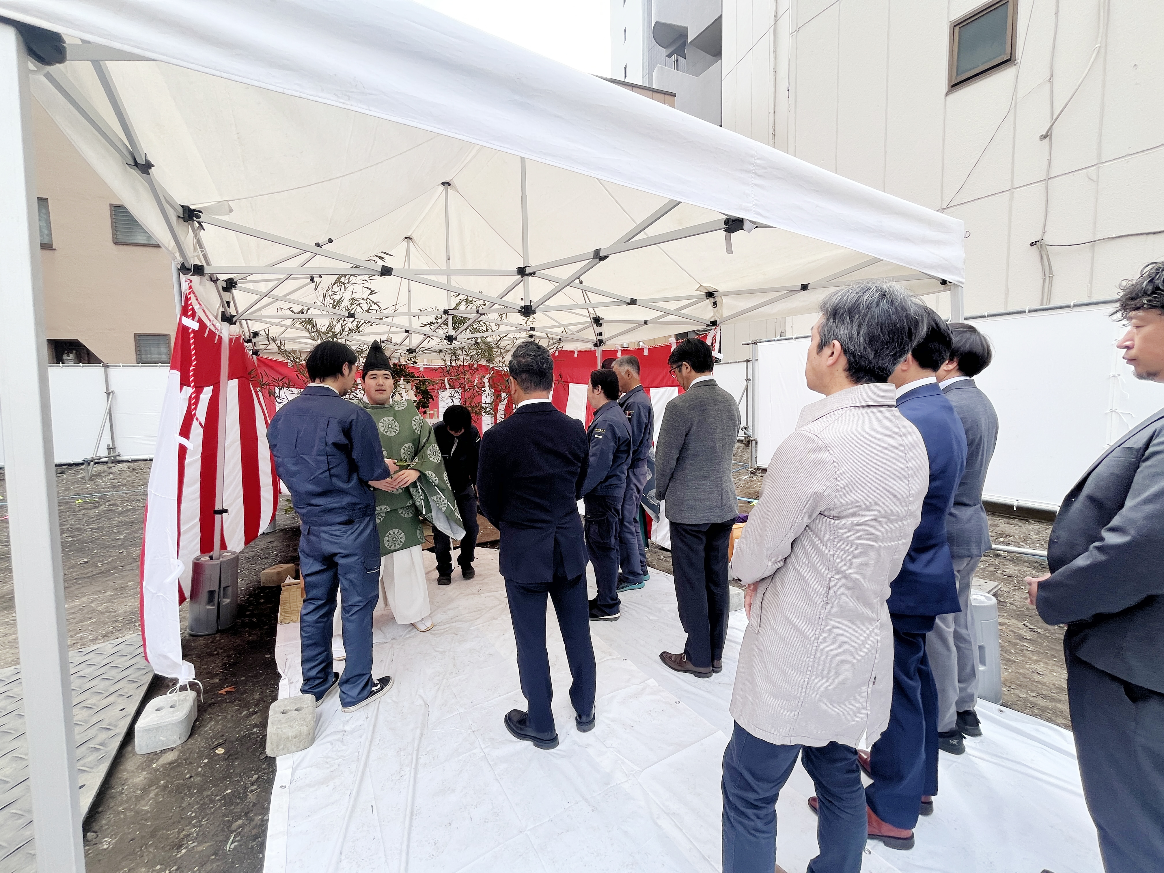 関係社員が参加し厳かな雰囲気の中、無事に式を終えることができました。神主様による祝詞奏上や清祓いの儀を通じて、この土地に敬意を払い、これから始まる工事の安全を祈願いたしました。