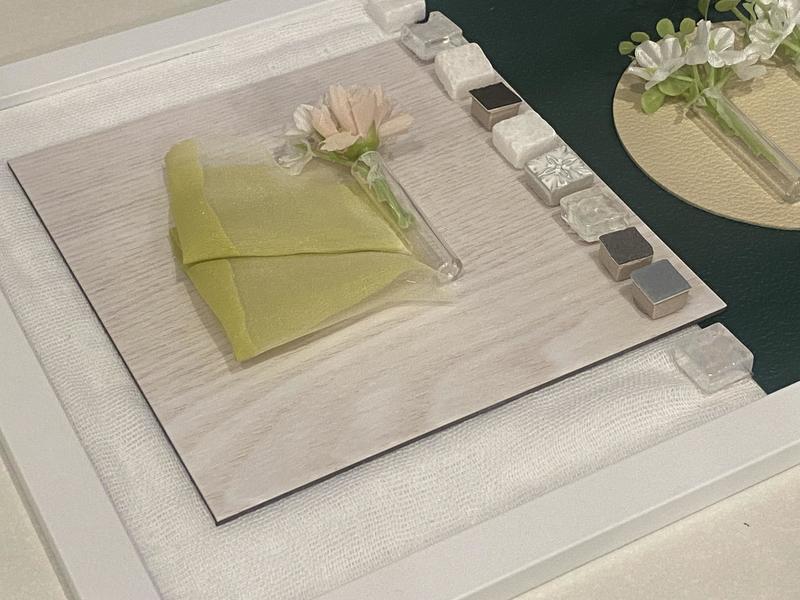 ガーゼ素材をベースにし、コントラストとして、RE53263の深いグリーンのクロスを重ねてみました。