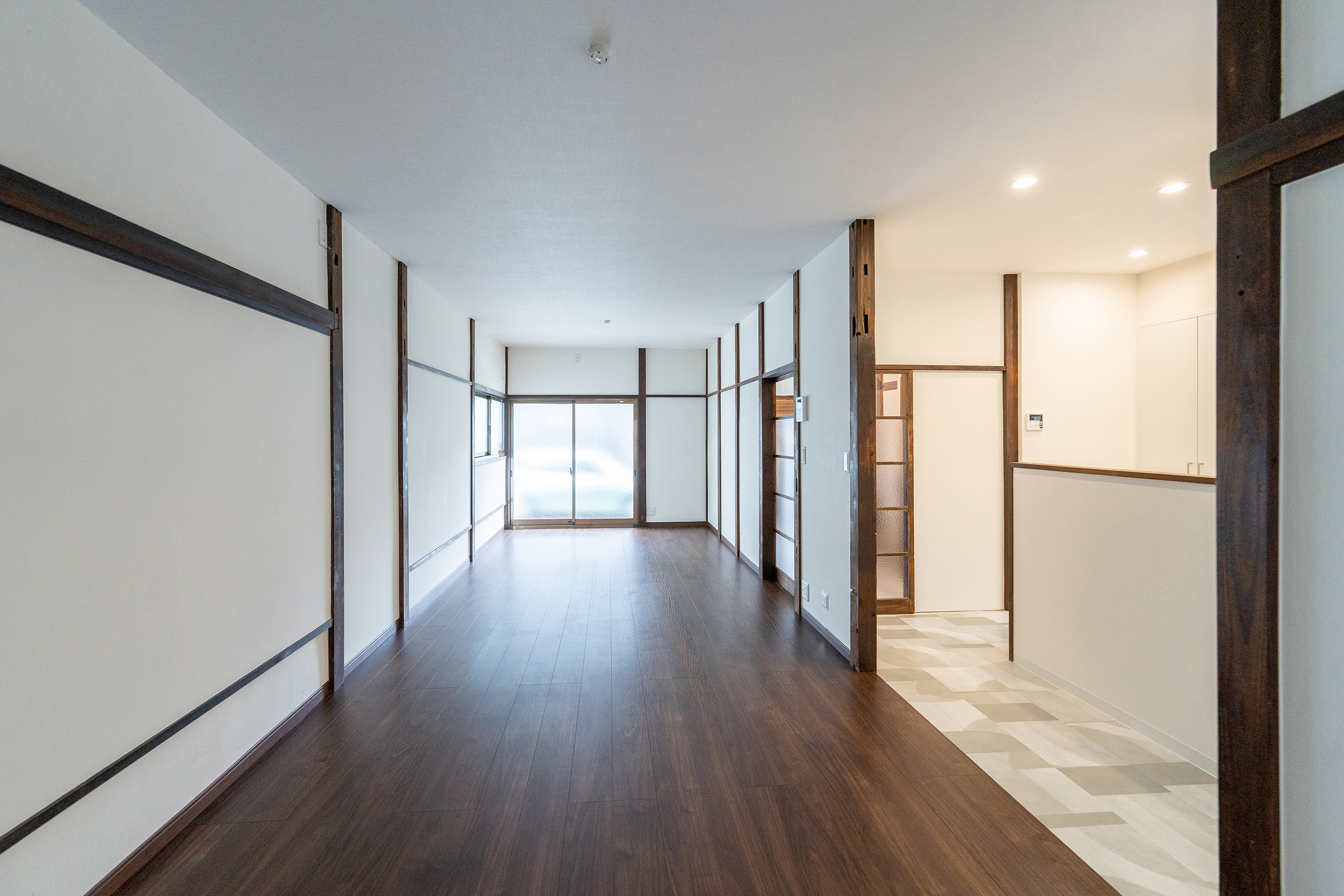 今回で3回目のご依頼を頂いた、東向島にある築70年の戸建リフォームです。ファミリー向けの賃貸として、収益に繋がる様プランニングさせて頂きました。1Fは広いダイニング・6帖の和室が2室・バランス釜のお風呂。2Fは、4.5帖/6帖/7.5帖の和室が3室。窓が多かったですが、近隣の家に光が遮られており、また塗り壁も経年劣化により汚れが染み込みとても薄暗い環境でした。今回は、予算削減も兼ね、古き良き建具や柱を残すミックス空間でご提案させて頂いたリフォーム実例です。